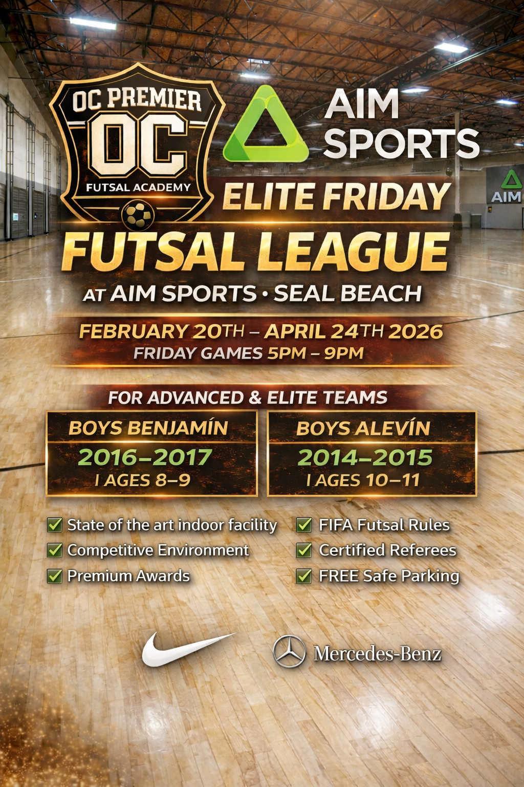 The Elite Friday Futsal League is a high-level youth futsal competition hosted at AIM Sports (Small Gym) in Seal Beach and operated by OC Premier Futsal Academy.