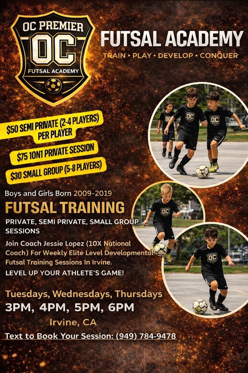 As a parent, you want to give your child every opportunity to grow, succeed, and stand out — and that starts with quality training. Our OC Premier Futsal Academy Private, Semi-Private, or Small Group Training sessions are designed to help your player(s) level up their individual game through focused, elite futsal-based development.